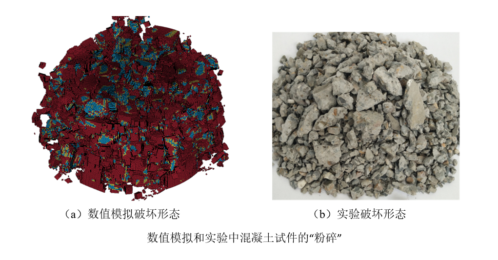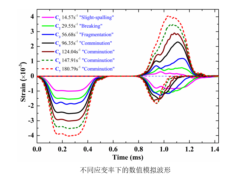 在此基礎上,進行了不同應變率下Ф120×100mm混凝土試件SHPB原型實驗數值模擬,重現了實驗中混凝土試件的四種典型的破壞形態的形成過程,觀察到實驗中出現的反射波“壓縮波”現象和“雙峰”現象,并預測了更高應變率下混凝土試件的破壞形態、波形特征和應力平衡失效。引入損傷失效體積的概念,分析了混凝土試件SHPB實驗中的應力平衡失效與波形特征之間的關系以及應力平衡失效后的材料行為,探討了骨料和砂漿之間的粘結層(ITZ)對波形特征的影響以及波形特征如何表征混凝土材料性能。