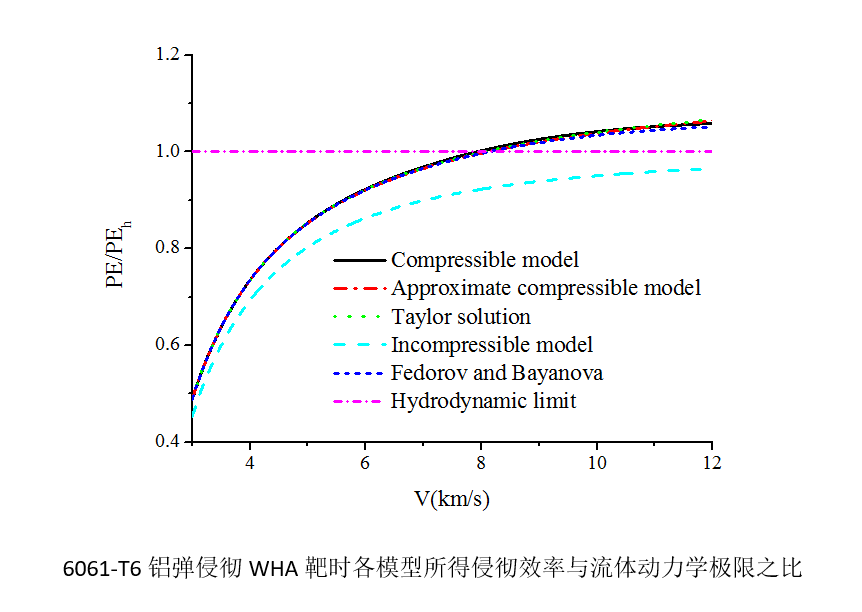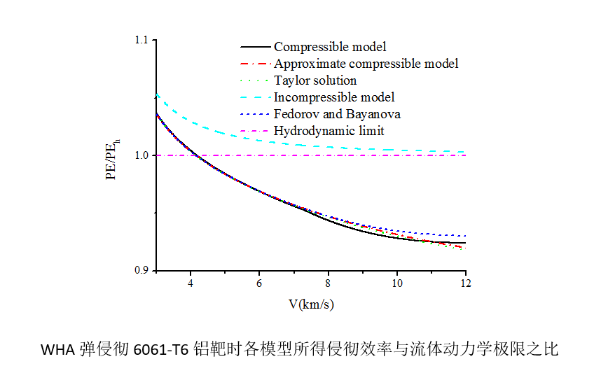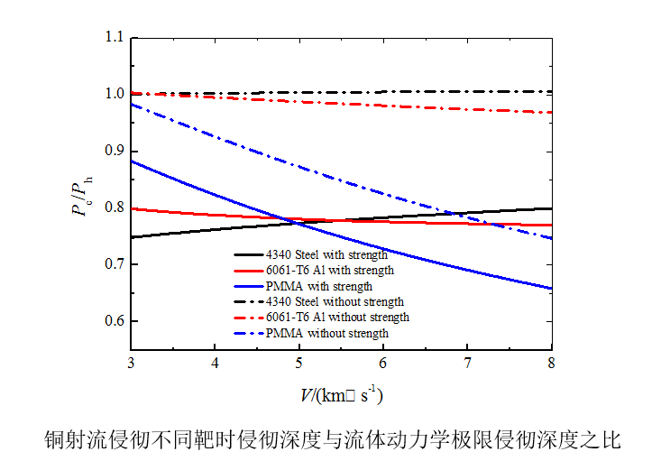 進一步利用近似可壓縮侵徹模型研究可壓縮性和強度對鎢合金長桿彈和銅射流侵徹半無限靶的影響。揭示了可壓縮性通過提高彈和靶駐點壓力來影響侵徹效率的機理。一般而言,在撞擊速度較低時,強度效應對侵徹深度影響較大,而可壓縮性影響可忽略;在撞擊速度較高時,強度效應影響很小,而可壓縮性有一定影響。進一步借助虛擬原點方法,通過侵徹速度和撞擊速度的線性關系引入可壓縮性和強度,研究強度和可壓縮性對射流侵徹的影響,結果表明靶的強度效應對侵徹深度影響嚴重。