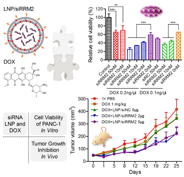 該研究首先針對靶基因RRM2設(shè)計了23條小干擾RNA(siRNA)藥物分子,通過高通量活性評價技術(shù)篩選出高活性的優(yōu)選siRNA分子,進而通過精確的化學(xué)修飾策略對藥物分子進行修飾,最終得到高活性、特異性及穩(wěn)定性的先導(dǎo)分子siRRM2。進一步,該研究以人胰腺癌細胞系PANC1為模型,在體外細胞水平、以及體內(nèi)荷瘤小鼠模型上開展研究,結(jié)果顯示,該先導(dǎo)分子單獨使用、或與臨床一線癌癥化療藥物阿霉素(DOX)聯(lián)合使用,均可有效將細胞分裂周期阻滯在S期,進而抑制腫瘤細胞生長、細胞集落形成,降低細胞活力,并在體內(nèi)顯著抑制腫瘤組織的生長。同時,該研究揭示siRRM2與DOX聯(lián)合使用的治療效果顯著優(yōu)于各自單獨使用,體現(xiàn)出了不同作用機制藥物之間良好的協(xié)同效應(yīng)。總之,該研究不僅為胰腺癌治療驗證了潛在新靶點(RRM2)、獲得了高效安全的新藥物分子,更為疾病防控建立了siRNA單用、或與化療藥聯(lián)用的治療新策略,具有一定的臨床轉(zhuǎn)化潛力。