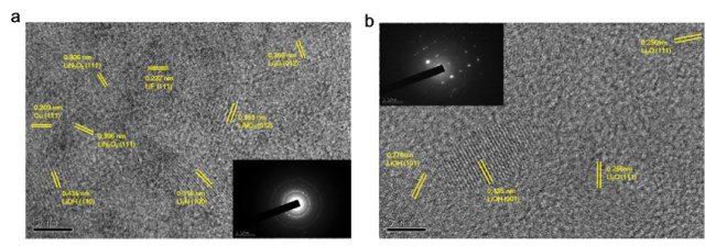 該團隊通過化學液相反應法,在金屬鋰電極表面設計了具有高楊氏模量、快速離子傳輸特性的離子/電子混合導體界面層(Mixed conductor interphase,簡稱MCI)。MCI層作為固液界面層(Solid electrolyte interphase,SEI)和金屬鋰電極之間的過渡層,在具有高離子導率的同時兼顧一定的電子導率。MCI層(圖1)中離散分布的銅原子打破了相對長程有序的晶體結構,形成了更多的晶界和多晶區域缺陷(圖2),保證了鋰離子在界面層中的快速傳導,微弱的電子導率為鋰離子在界面層中的遷移提供了遷移電場作為驅動力,對于定向引導鋰離子輸運具有重要價值。