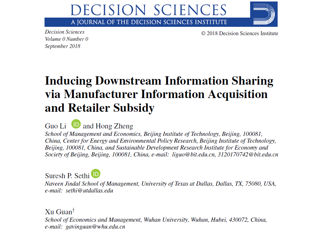 編輯:王笑竹 審核:顏志軍 閱讀次數:北京理工大學管理與經濟學院李果教授(第一作者),鄭鴻博士生等合作的研究成果《Inducing Downstream Information Sharing via Manufacturer Information Acquisition and Retailer Subsidy》于2018年10月1日在決策科學類國際頂級期刊《Decision Sciences》上在線發表。