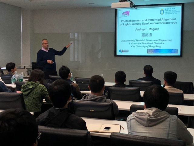 Andrey L. Rogach教授作了題為“Light-Emitting Colloidal Nanostructures”的學術報告。參會老師和同學們在II-VI族量子點、鈣鈦礦量子點,納米團簇的精細調控,性能提高及發光應用方面進行了深入的討論,Andrey L. Rogach教授分享了其學術思想和經驗,并解答了現場提出的問題。報告深入淺出,現場氣氛熱烈,講座在大家的欲猶未盡中結束。