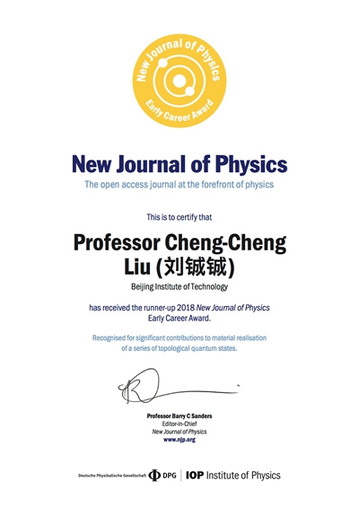 近日,《新物理學期刊》(《New Journal of Physics》)在其網站上公布了2018年度“《新物理學期刊》早期職業獎”(“the runner-up 2018 New Journal of Physics Early Career Award”),亞軍獲獎者為北京理工大學劉鋮鋮特別研究員,以表彰他在一系列拓撲量子態的材料實現方面的重要貢獻(“Recognised for significant contributions to material realisation of a series of topological quantum states. ”)。“《新物理學期刊》早期職業獎” 面向博士畢業五年內且在該期刊上發表過文章的青年科研人員,每年頒發一次,每次冠軍一名、亞軍一名。該榮譽自2016年開始授予,3年內全球共有6人入選,劉鋮鋮特別研究員是目前亞洲地區的唯一一名入選學者。