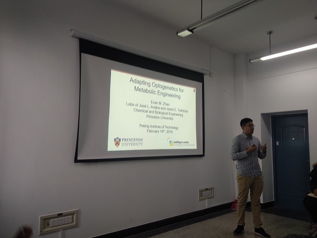 編輯:李亞鑫 審核:李春 閱讀次數:應北京理工大學化學與化工學院生化工程系/合成生物系統研究所邀請,美國普林斯頓大學(Princeton University)化學工程系Evan M. Zhao博士于2019年2月18日上午來到北京理工大學化學與化工學院生化工程系/合成生物系統研究所,為北理工師生帶來題為“Light-Dependent Pathway Enhancement for Microbial Chemical Production”的學術報告。李春教授主持本次學術報告會,化學與化工學院、求是書院、天津大學的部分教師及研究生五十余人參加了報告會。