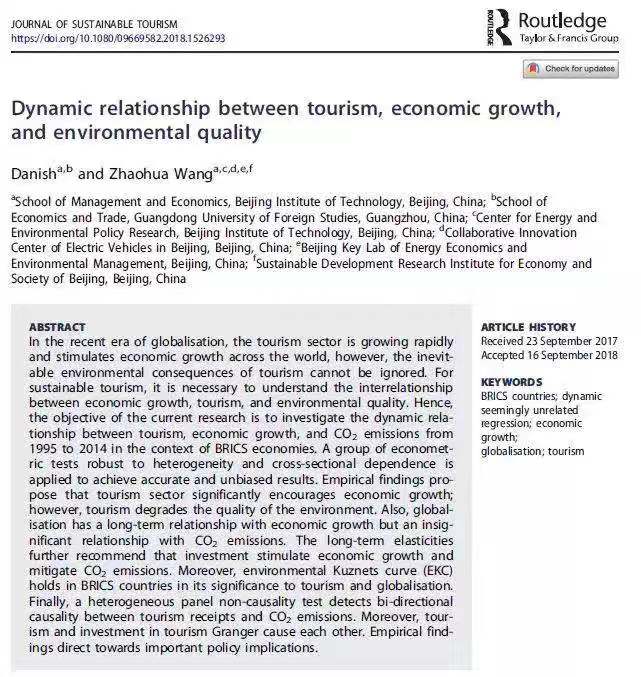 北理工管理與經(jīng)濟(jì)學(xué)院王兆華教授領(lǐng)銜的團(tuán)隊(duì)研究成果“旅游、經(jīng)濟(jì)與環(huán)境質(zhì)量的動態(tài)關(guān)系”(Dynamic Relationship Between Tourism, Economic Growth, and Environmental Quality),發(fā)表于國際旅游研究頂級期刊《Journal Of Sustainable Tourism》。該刊是國際旅游研究中公認(rèn)的四大權(quán)威期刊之一,根據(jù)Web of Science期刊排名,該期刊在SSCI期刊“綠色&可持續(xù)科學(xué)&技術(shù)”類別中排名第一,屬SSCI一區(qū)期刊。文章第一作者Danish博士為我院研究生,王兆華教授是該文通訊作者。