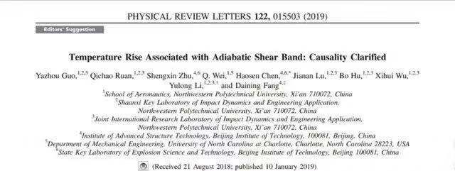 日前,物理學(xué)頂級期刊《物理評論快報(bào)》(Physical Review Letters)在線報(bào)道了西北工業(yè)大學(xué)、北京理工大學(xué)(共同完成單位)聯(lián)合研究成果。在方岱寧院士、李玉龍教授的指導(dǎo)下,郭亞洲副教授(第一作者)、陳浩森副教授(共同通訊作者)、朱盛鑫博士和阮啟超碩士等開展了絕熱剪切帶的產(chǎn)生和溫度之間的因果關(guān)系研究 (Temperature Rise Associated with Adiabatic Shear Band: Causality Clarified),這篇文章主編被選為“Editor’s Suggestion” 。