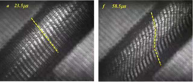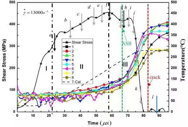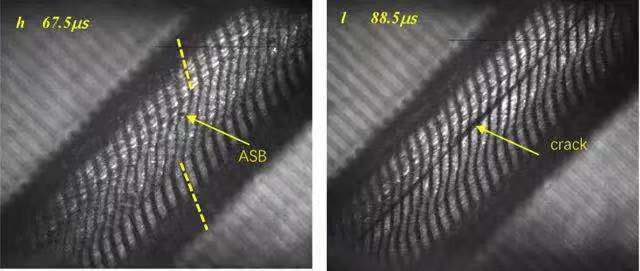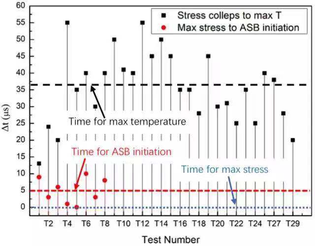 圖4給出了絕熱剪切局部化過程中典型事件發(fā)生時刻的相對關(guān)系。絕熱剪切帶的萌生時刻出現(xiàn)在最大應(yīng)力時刻點(diǎn)之后。實(shí)驗(yàn)結(jié)果意味著基于熱-塑性失穩(wěn)的臨界準(zhǔn)則預(yù)測的臨界剪切應(yīng)變可能會偏小。絕熱剪切帶萌生時刻的溫度大約50-90?C,導(dǎo)致的應(yīng)力下降30-54MPa。同時,變形區(qū)域的溫度分布表明材料沒有出現(xiàn)局部化的熱軟化。此外,由于應(yīng)變率硬化使得材料的應(yīng)力增大了50-60MPa。因此,熱軟化效應(yīng)不足以促使應(yīng)力的陡降或絕熱剪切帶的萌生。當(dāng)絕熱剪切帶萌生后的30μs,溫度達(dá)到最大值。溫度的快速上升可以認(rèn)為是絕熱剪切帶形成和傳播導(dǎo)致的。同時,通過分析高速相機(jī)獲得變形過程,可以知道絕熱剪切帶完全傳播到整個試樣的時間小于10μs。因此,更大局部變形促進(jìn)絕熱剪切帶的發(fā)展,更帶來了局部更高的溫度。如將絕熱剪切局部化過程中的典型事件按照時間先后排序:應(yīng)力峰值-絕熱剪切帶萌生-絕熱剪切帶傳播/溫度上升-最大溫度/宏觀裂紋。絕熱剪切帶萌生后的溫度上升意味著溫升不是觸發(fā)絕熱剪切帶形成的原因,而是絕熱剪切局部化導(dǎo)致了溫度的上升。傳統(tǒng)的絕熱剪切帶熱軟化機(jī)理應(yīng)該需要被重新認(rèn)識。