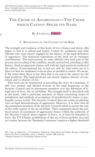 在英國國際法年刊上發(fā)表的The Crime of Aggression –The Crime which Cannot Speak its Name一文分析了將侵略罪引入《國際刑事法院規(guī)約》的法律意義。文章認(rèn)為,安理會常任理事國拒絕接受編纂該法律的做法是明智的,否則會違背《聯(lián)合國憲章》禁止使用武力規(guī)則。Carty認(rèn)為,國際社會有必要重新考慮國際法的基礎(chǔ),從而克服各國間彼此感到的巨大焦慮和不安。要維護(hù)世界和平,需要各國人民重新發(fā)現(xiàn)并對正義、相互尊重和相互理解達(dá)成共識。
