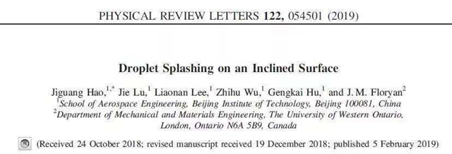 日前,北京理工大學(xué)宇航學(xué)院郝繼光講師、胡更開教授和加拿大西安大略大學(xué)Floryan教授合作在物理學(xué)頂級的學(xué)術(shù)期刊《Physical Review Letters》上發(fā)表了題為《Droplet splashing on an inclined surface》的研究論文。郝繼光為該論文第一和通訊作者,宇航學(xué)院2018級碩士研究生魯杰、2015級本科生李遼南及2017級碩士研究生吳志鵠分別為第二、第三和第四作者,北京理工大學(xué)為論文的第一單位和唯一通訊單位,該工作得到了國家自然科學(xué)基金和“111”引智計(jì)劃的支持。