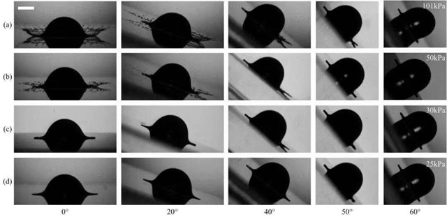 圖1 表面傾角和環(huán)境壓力對液滴飛濺的影響