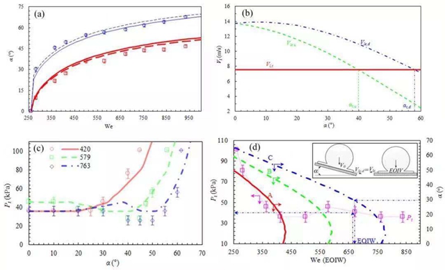 圖2 液滴飛濺臨界參數(shù)實(shí)驗(yàn)結(jié)果(符號)及理論模型計(jì)算結(jié)果(曲線)