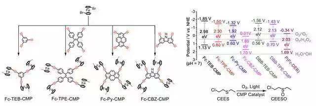 水污染等環(huán)境問題是當(dāng)今社會面臨的一大挑戰(zhàn),通過光催化反應(yīng)對污染物進(jìn)行高級氧化降解有望成為一種更加高效、節(jié)能的污染物處理方法。王博、馮霄團(tuán)隊(duì)通過三鍵聚合反應(yīng)構(gòu)筑了系列基于二茂鐵基元的共軛微孔聚合物(Fc-CMPs)用于有毒有害物質(zhì)降解研究。Fc-CMPs具有較大的孔徑和比表面積,使得污染物容易進(jìn)入孔道進(jìn)行預(yù)富集并可充分接近易發(fā)生氧化還原反應(yīng)的內(nèi)表面,同時Fc-CMPs合適的分子軌道能級使得這類材料可高效產(chǎn)生活性氧物種。在可見光和模擬太陽光下,F(xiàn)c-CMPs光催化降解亞甲藍(lán)的能力均優(yōu)于二氧化鈦 (P25),并且能夠?qū)⒒瘜W(xué)戰(zhàn)劑芥子氣模擬物(2-氯乙基乙基硫醚)完全轉(zhuǎn)化為無毒產(chǎn)物。該研究工作發(fā)表在《德國應(yīng)用化學(xué)》上(Angew. Chem. Int. Ed. , 2019, DOI: 10.1002/anie.201813598),文章第一作者為博士生馬麗,通訊作者為王博和馮霄。
