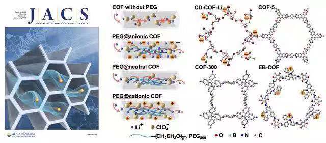 在前期工作中( Angew. Chem. Int. Ed., 2017, 56 , 16313,第一作者為博士生張媛媛,通訊作者為馮霄),該團(tuán)隊(duì)曾成功開發(fā)出基于環(huán)糊精的三維共價(jià)有機(jī)骨架材料(CD-COFs),該系列COFs為首次利用柔性基元構(gòu)筑的具有 rra 拓?fù)鋵W(xué)結(jié)構(gòu)并通過離子型硼元素連接的三維COFs材料。其中,CD-COF-LiéLiPF6-EC-DMC的室溫鋰離子電導(dǎo)率可以達(dá)到2.7 mS/cm。然而,其中殘留的微量電解液可能會在實(shí)際應(yīng)用過程中帶來一定的安全隱患。為解決這一問題,該團(tuán)隊(duì)將低分子量聚乙二醇(PEG)裝載入COF孔道中加速鋰離子傳導(dǎo),制備出沒有溶劑殘留的全固態(tài)電解質(zhì),并系統(tǒng)性研究了COF骨架電荷對于鋰離子傳導(dǎo)行為的影響,實(shí)現(xiàn)大于0.6的鋰離子遷移數(shù)以及120 °C 下1.8 mS/cm的離子傳導(dǎo)速率。這一簡單的通過擔(dān)載PEG加速離子傳導(dǎo)并提高工作溫度范圍的策略為將多孔材料進(jìn)一步應(yīng)用于全固態(tài)電池領(lǐng)域提供了可能。該研究工作發(fā)表在《美國化學(xué)會志》上,并被選為封面文章( J. Am. Chem. Soc. , 2019, 141, 1923),文章第一作者為碩士生郭振彬和博士生張媛媛,通訊作者為王博和馮霄。