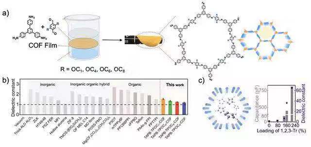 有機(jī)多孔材料大多不溶不熔,為其進(jìn)一步器件化等實(shí)際應(yīng)用帶來了巨大挑戰(zhàn)。該團(tuán)隊(duì)在前期大量成膜化研究基礎(chǔ)上,成功利用液液界面成膜法開發(fā)了具有不同長度烷氧基鏈修飾的系列COF薄膜材料,并對其介電常數(shù)等相關(guān)性質(zhì)進(jìn)行了研究。該系列柔性的COF膜具有接近于空氣的介電常數(shù)值(在105 Hz下, κ = 1.19 ± 0.04),可媲美目前已報(bào)道的無機(jī)多孔材料,并且這類COF薄膜材料表現(xiàn)出較好的機(jī)械性能、低介電損耗、高擊穿電壓、低漏電流、高抗?jié)穸群涂箯澱勰芰Α5徒殡姵?shù)材料被廣泛應(yīng)用于電子電路器件中的絕緣層,用于減少信號延遲、串?dāng)_噪聲和能量耗散。除此之外,高介電常數(shù)材料可以應(yīng)用于場效應(yīng)晶體管的柵極和電容器當(dāng)中,該團(tuán)隊(duì)還利用COF薄膜裝載小分子極性化合物,可將其介電常數(shù)提升43倍。該研究工作發(fā)表在《德國應(yīng)用化學(xué)》上( Angew. Chem. Int. Ed. , 2018, 57, 16501),文章第一作者為博士生邵鵬鵬、李婕,通訊作者為王博和馮霄。