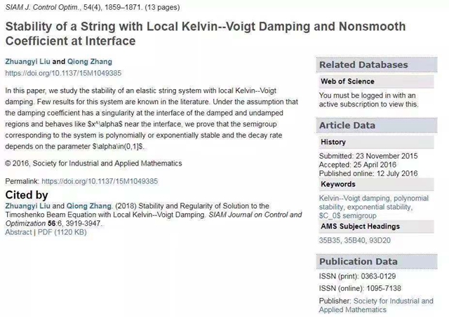 日前,北京理工大學(xué)數(shù)學(xué)與統(tǒng)計(jì)學(xué)院張瓊副教授與美國明尼蘇達(dá)大學(xué)Zhuangyi Liu教授合作在國際頂級學(xué)術(shù)期刊《SIAM Journal of Control and Optimization》上發(fā)表了題為“Stability of a string with local Kelvin–Voigt damping and nonsmooth coefficient at interface”和“Stability and regularity of solution to the Timoshenko beam equation with local Kelvin-Voigt damping”的研究論文。這兩篇論文分別分析了具局部分布的Kelvin–Voigt擾動的弦系統(tǒng)和Timoshenko梁系統(tǒng)的穩(wěn)定性與正則性。