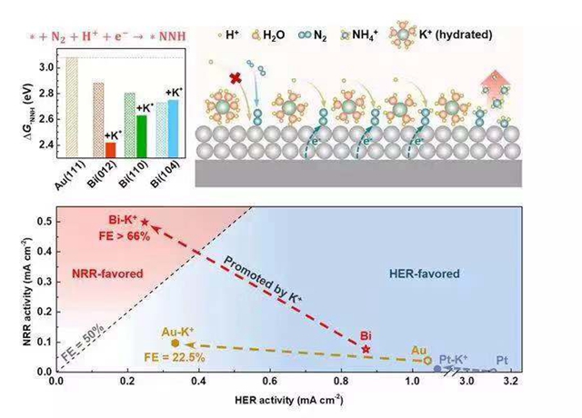 研究者開創(chuàng)性地利用非貴金屬催化劑(鉍納米催化劑)與堿金屬(鉀離子)助催化劑之間的協(xié)同作用,成功增強(qiáng)氮?dú)夥肿釉诖呋瘎┍砻娴奈脚c活化,同時抑制析氫副反應(yīng),從而突破已有極限,大幅提高電催化合成氨的選擇性與反應(yīng)速率。在常溫常壓(25攝氏度,1個大氣壓)下,從水和氮?dú)獬霭l(fā),即可實(shí)現(xiàn)高選擇性(電子利用率高于66%)和高速率(3.4 g NH? g-1 h-1)產(chǎn)氨。該結(jié)果較目前已有報(bào)道有數(shù)量級上的提升,為電化學(xué)合成氨的實(shí)用化提供了可能。值得一提的是,該催化體系還具有廣泛適用性。不僅限于鉍催化劑,堿金屬的促進(jìn)作用還適用于一系列常用催化劑(如Pt、Au等)。此外,該催化體系對具有重要能源與環(huán)境意義的二氧化碳電催化還原反應(yīng)同樣具有顯著的提升作用。本研究為溫和條件下利用可持續(xù)能源高效合成氨提供了新的途徑。