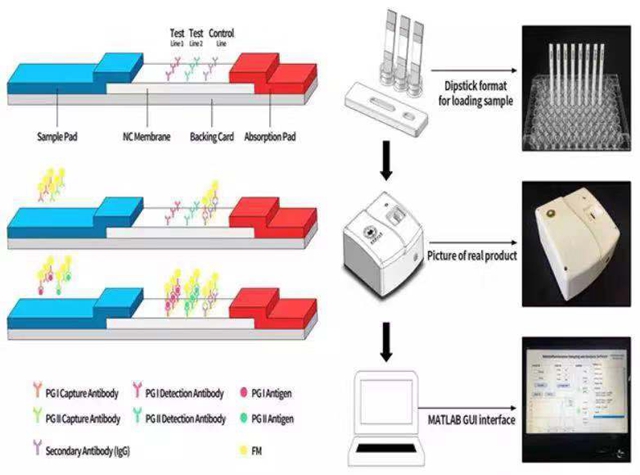 胃癌的早期診斷和治療是胃癌防治的重要手段,可以提高存活率并對預(yù)后防控提供有效的指導(dǎo),所以應(yīng)在胃癌高發(fā)地區(qū)大力推廣早癌篩查工作。胃蛋白酶原(PG)屬于胃粘膜分泌的特定蛋白酶組,可分為兩大類:胃蛋白酶原I(PG I)和胃蛋白酶原II(PG II)。PG的分泌水平反映了胃粘膜的形態(tài)和功能狀態(tài),被在同樣是胃癌高發(fā)地區(qū)的日本和韓國作為胃癌篩查的生物標(biāo)志物應(yīng)用于全國范圍性的篩查工作。然而,目前用于檢測PG I和PG II的方法耗時耗力,且需要專業(yè)的實(shí)驗(yàn)室環(huán)境配備,不適用于我國的胃癌大規(guī)模篩查,亟需一種可以實(shí)現(xiàn)快速且靈敏的PG I和PG II同時檢測方法,為大規(guī)模胃癌篩查提供可行方案。