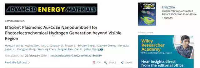 團(tuán)隊(duì)與中科院大連化物所李燦院士團(tuán)隊(duì)合作,在金屬@半導(dǎo)體異質(zhì)納米結(jié)構(gòu)研究積累基礎(chǔ)上(Science, 2010; Adv. Mater., 2014; Angew. Chem. Int. Ed., 2015; Adv. Mater., 2016; Nano Energy, 2018; Nano Energy, 2019; J. Mater. Chem. Mater. A, 2018)通過精確調(diào)控Au/Ag核殼納米晶的硒化反應(yīng)以及逆向競爭的水相陽離子交換反應(yīng),實(shí)現(xiàn)了從核殼結(jié)構(gòu)(core/shell)到啞鈴結(jié)構(gòu)(nanodumbbell)演變的Au/CdSe異質(zhì)納米棒的制備及異質(zhì)界面的高質(zhì)量構(gòu)建。得益于Au棒的縱向SPR效應(yīng)及兩端的電磁場增強(qiáng)“熱點(diǎn)”以及高質(zhì)量的異質(zhì)界面,制備的Au/CdSe HNRs在近紅外區(qū)具有很強(qiáng)的光吸收特性,實(shí)現(xiàn)了Plasmon增強(qiáng)的高效熱電子注入效應(yīng)。結(jié)合空間分辨的表面光電壓成像表征(與李燦院士團(tuán)隊(duì)合作),成功研發(fā)出一種在近紅外光波段具有高的吸收效率,又具有高的可見-近紅外光電催化產(chǎn)氫性能,且其法拉第效率高達(dá)96%的光電催化材料。光電催化產(chǎn)氫活性(45.29 μmol cm-2 h-1)通過5天的連續(xù)測試,沒有明顯降低。北理工的王虹智博士研究生以及大連化物所的高玉英博士研究生為共同第一作者。相關(guān)工作以“Efficient plasmonic Au/CdSe Nano-dumbbell for Photoelectrochemical Hydrogen Generation beyond Visible Region”為題,在線發(fā)表在《Advanced Energy Materials》 (2019, DOI: 10.1002/aenm.201803889)上。