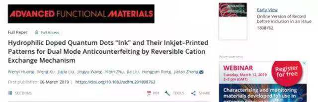 團(tuán)隊(duì)基于已有的半導(dǎo)體摻雜納米晶/量子點(diǎn)研發(fā)基礎(chǔ)(Angew. Chem. 2015; Adv. Mater. 2015; Nature Nanotech. 2018; Angew Chem. 2018),發(fā)現(xiàn)了Ag摻雜CdX(X="S," Se等)等II-VI族量子點(diǎn)的可逆陽離子交換(Ag2X與CdX之間的可逆轉(zhuǎn)化)可多次實(shí)現(xiàn)有無熒光的切換。然后通過表面配體交換以及摻雜量子點(diǎn)分散在堿性水/乙二醇溶劑中,實(shí)現(xiàn)了可控粘度的“墨水”制備。進(jìn)而實(shí)現(xiàn)了摻雜量子點(diǎn)在不同襯底(羊皮紙,紙幣,PET等柔性襯底)上的噴墨打印和圖案化(宏觀厘米、分米尺寸器件規(guī)模)。利用可控的熒光切換實(shí)現(xiàn)了更高安全性的多模式防偽應(yīng)用。相關(guān)工作以“Hydrophilic Doped Quantum Dots “Ink” and Their Inkjet-Printed Patterns for Dual Mode Anti-Counterfeiting by Reversible Cation Exchange Mechanism”為題,在《Advanced Functional Materials 》(DOI: 10.1002/adfm.201808762)在線發(fā)表。黃文藝碩士研究生和徐萌講師為論文共同第一作者。