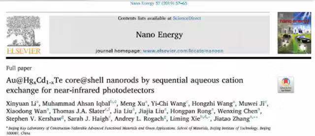 團(tuán)隊(duì)在Au@HgxCd1-xTe金屬/碲化物半導(dǎo)體核殼納米棒的精準(zhǔn)合成基礎(chǔ)上,基于殼層材料的窄帶隙特點(diǎn)以及Au納米棒的表面等離子體共振效應(yīng),實(shí)現(xiàn)連續(xù)可調(diào)的可見光-近紅外吸收特性。與國家納米中心謝黎明研究員團(tuán)隊(duì)(光電探測器件表征)、英國曼徹斯特大學(xué)Sarah J. Haigh教授(高分辨STEM表征)、香港城市大學(xué)Andrey L. Rogach教授(海外名師計(jì)劃資助)合作,利用石墨烯高載流子遷移率的特點(diǎn),實(shí)現(xiàn)了石墨烯/Au@HgxCd1-xTe納米棒光電器件的合成。所合成的器件實(shí)現(xiàn)了可見光到近紅外寬波段(550-1300 nm)的高光響應(yīng)效率(~106 A/W)。展示了其在紅外光電探測領(lǐng)域方面的應(yīng)用價(jià)值。相關(guān)工作以“Au@HgxCd1-xTe core@shell nanorods by sequential aqueous cation exchange for near-infrared photodetectors”為題發(fā)表在《Nano Energy》 雜志上(2019, 57, 57-65)。李欣遠(yuǎn)博士研究生為論文第一作者。
