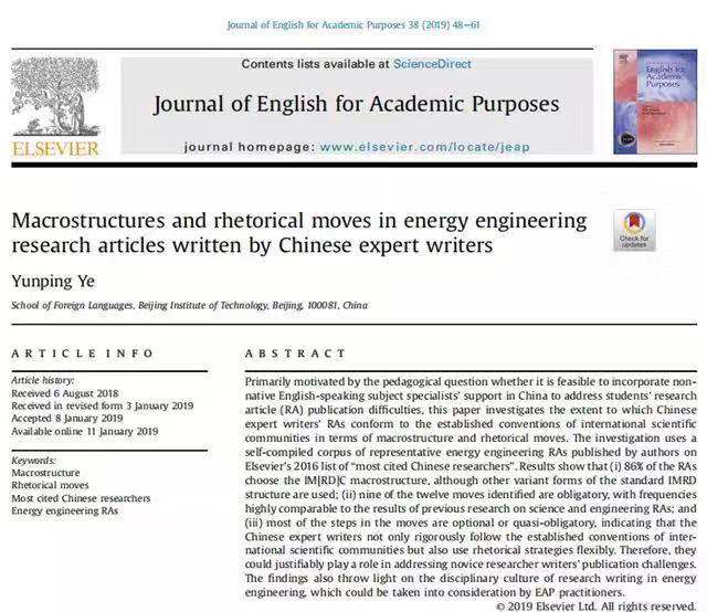 北京理工大學(xué)外國語學(xué)院葉云屏教授對70多名高被引“中國能源專家科研論文宏觀結(jié)構(gòu)和修辭語步”的研究論文于2019年在《學(xué)術(shù)英語期刊》(Journal of English for Academic Purposes)第38卷發(fā)表,填補(bǔ)了國際語言學(xué)界對該領(lǐng)域科研論文研究的空白以及對中國專家學(xué)術(shù)寫作特征研究的空白,為國內(nèi)外學(xué)術(shù)寫作教學(xué)實(shí)踐提供了重要啟示。