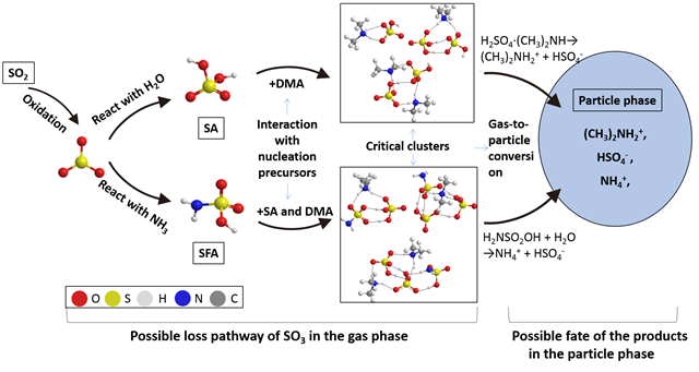 兩團隊合作,將量子化學計算和大氣團簇動力學模型相結合,發現在NH3濃度較高的污染干燥地區,重要的大氣污染物SO3和NH3的自催化反應是SO3除與H2O反應之外的另一條重要消耗路徑。同時發現反應產物氨基磺酸可不同程度增強城市地區大氣關鍵成核團簇的形成速率。最終提出高度污染地區NH3和SO3自催化反應引發的氣溶膠顆粒物新粒子形成的新機制(圖1),為我國復合大氣污染條件下顆粒物形成提供了新的研究思路和理論指導。