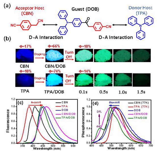 具有有機室溫磷光性能的材料由于具有熒光材料所不具備的延時發光特性,所以在防偽、生物成像、光電器件等領域具有很強的應用前景。且有機磷光材料相比無機貴金屬磷光材料又具有成本低、可塑性強、低毒性等優勢,所以引起了研究者的廣泛注意。傳統的有機磷光材料帶有咔唑,羰基或者氯等鹵族重原子等。最近日本的Adachi教授等報道了主客體摻雜導致的室溫磷光材料,但是此類材料的主體和客體必須一個是給體一個是受體。為了拓展主體或者客體的使用性,董宇平課題組首先設計合成了以三苯胺和苯乙腈為單元的具有D-A結構的客體化合物DOB,該客體具有微弱的短壽命磷光,并選擇DOB的前體化合物即具有給體性質的三苯胺(TPA)和具有受體性質的對氰基苯乙腈(CBN)分別作為主體。DOB中的三苯胺單元會和主體CBN發生給受體之間的相互作用,同樣DOB中的苯乙腈單元也會和主體TPA發生給受體相互作用。且由于DOB含有三苯胺和苯乙腈部分,會使得DOB容易進入到主體的晶格當中。作者按照客體和主體摩爾比為0.0005:1的比例通過重結晶的方法得到了摻雜材料CBN/DOB和TPA/DOB。相比原本的主體僅具有微弱的熒光,摻雜后的材料具有非常強的熒光(Ф=63%-76%)以及長壽命室溫磷光(Ф=7.6%-14.5%, τ="119" ms-317 ms)。作者認為主客體之間的相互作用使得摻雜材料產生新的能級,從而導致摻雜材料具有明顯的室溫磷光性能。