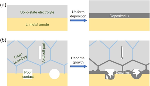 圖1(a)無缺陷的理想固態電解質具備抑制枝晶生長的潛力;(b)實際固態電解質由于自身缺陷和較差的界面行為,存在嚴重的金屬鋰枝晶生長行為。