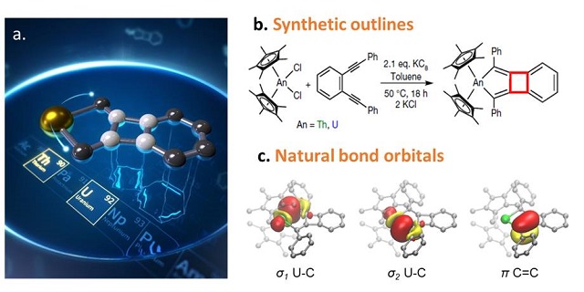 圖1. a. 錒系金屬取代亞聯苯化合物展示反芳香性的四元環和芳香性的五元環.b. 合成路線. c. 自然成鍵軌道(NBO)顯示U-C sigma鍵。