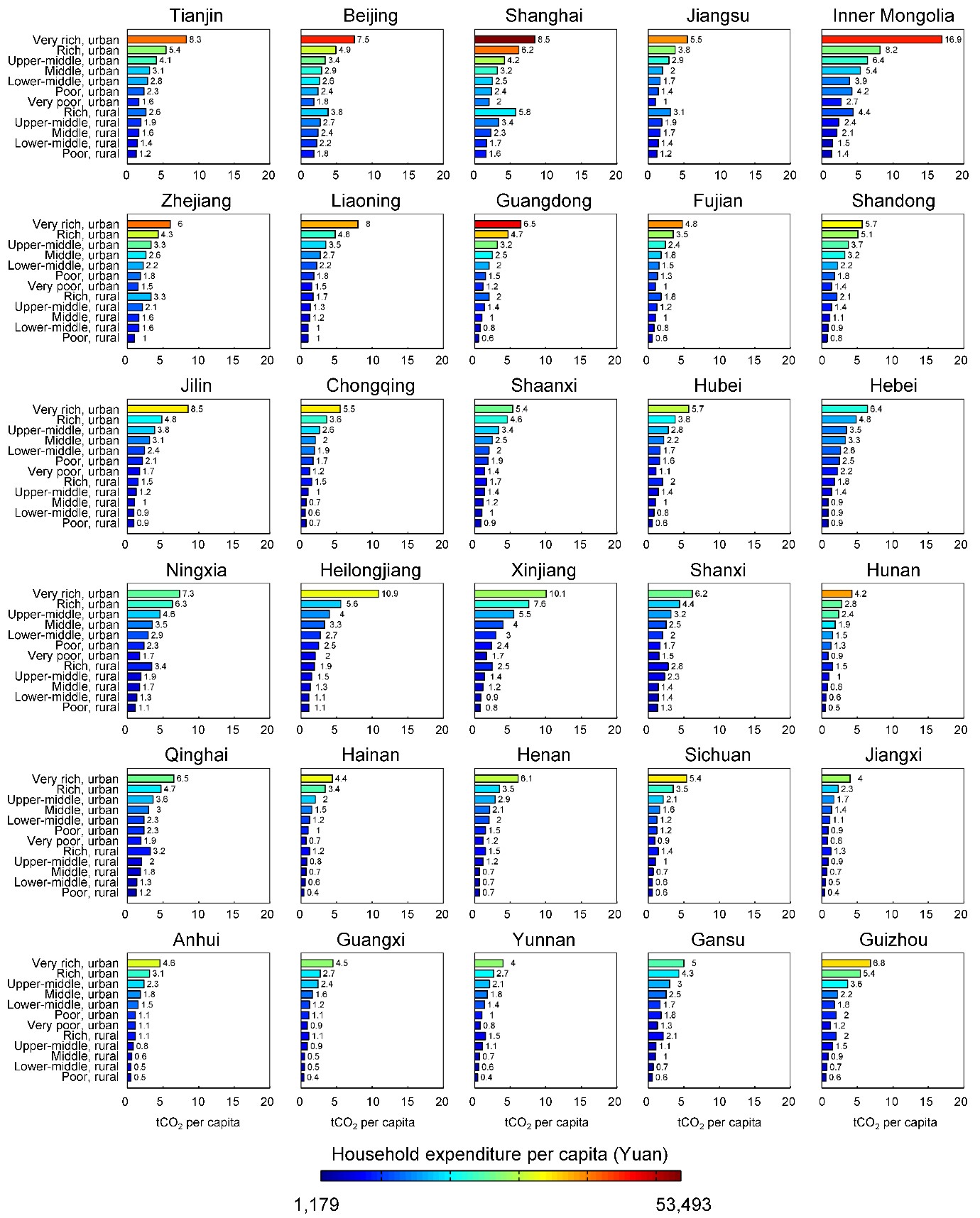 研究還發現,中國經濟增長有利于促進家庭碳足跡的公平性。從時間跨度看,中國碳足跡基尼系數(該系數越小意味著越平等)從2007年的0.44下降到2012年的0.37。從空間視角看,富裕地區的家庭碳足跡公平性相對較高。例如,2012年,天津、北京、上海和江蘇的人均GDP均超6.8萬,其碳足跡基尼系數也相對較低,分別為0.19、0.16、0.14和0.18。相反地,欠發達地區的碳足跡基尼系數相對較高。例如,貴州的碳足跡基尼系數為0.38。