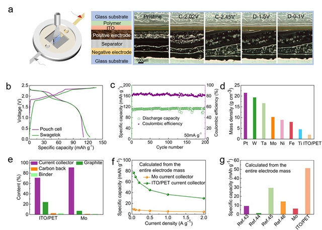 圖4. 整體性能評估。(a)光學電池設備圖,單個電池內部結構,不同充放電狀態的現場光學圖片。(b)不同類型電池的充放電循環。(c)使用基于軟包電池裝置的ITO/PET集流體的全電池循環數據(50 mA g?1)。(d)各種集流體的質量密度。(e)整個正極的活性石墨、集電極、炭黑和粘合劑的質量占比。(f)以ITO/PET和Mo作為正極集流體的全電池的比容量。(g)比較其他全電池研究中石墨正極與各種集流體的比容量(從整個電極質量計算),其中電極參數由相應的參考文獻提供[43?46]。
