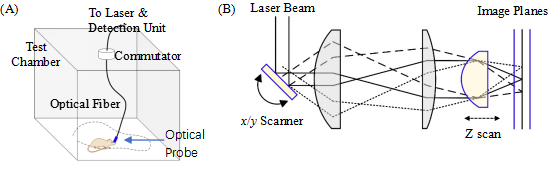 圖1. (A) 光學成像中的可自由活動的小動物,微型光纖探頭固定于其頭部。(b)微型探頭內部的三維掃描光路。