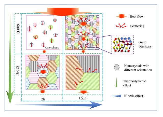 圖2 納米晶析出與長(zhǎng)大對(duì)合金熱傳輸性能影響示意圖