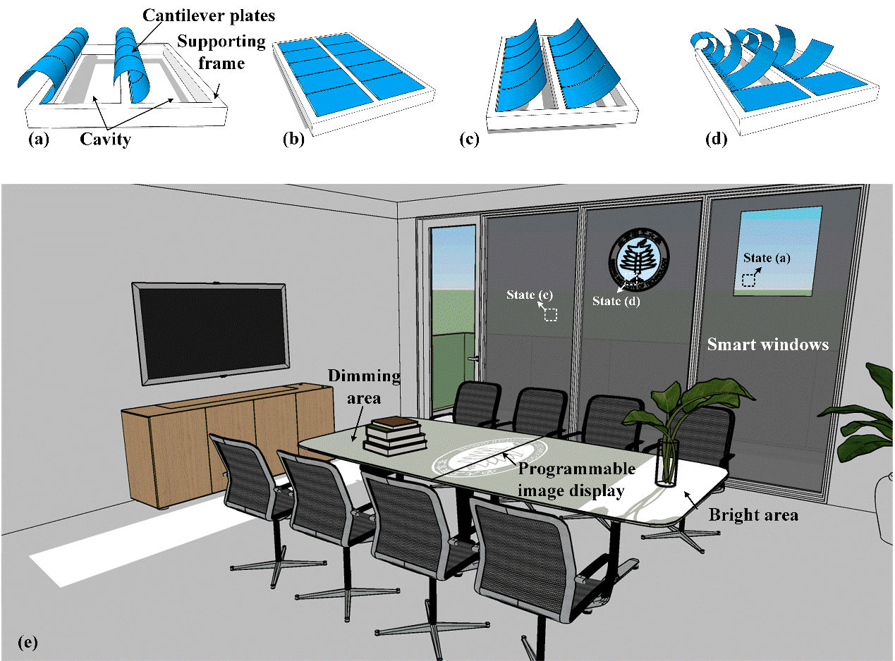 圖1.(a)電熱式Microshutter的開態(tài);(b)關(guān)態(tài);(c)半開態(tài);(d)多態(tài)混合;(e)可連續(xù)控光Mircoshutter的應(yīng)用場景:智能窗戶。