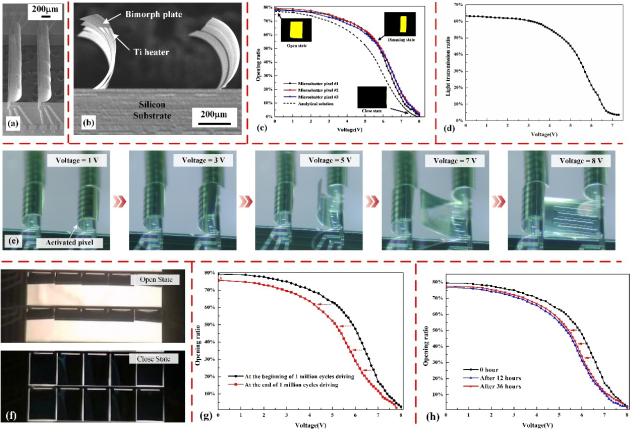 圖2.(a)電熱式Microshutter陣列的SEM圖(俯視圖);(b)電熱式Microshutter陣列的SEM圖(正視圖);(c)單像素通光率與驅(qū)動電壓的關(guān)系;(d)陣列通光率與驅(qū)動電壓的關(guān)系;(e)Microshutter隨驅(qū)動電壓增加的形變示意圖;(f)陣列的開關(guān)態(tài);(g)百萬次驅(qū)動可靠性測試;(h)長時間加電可靠性測試。