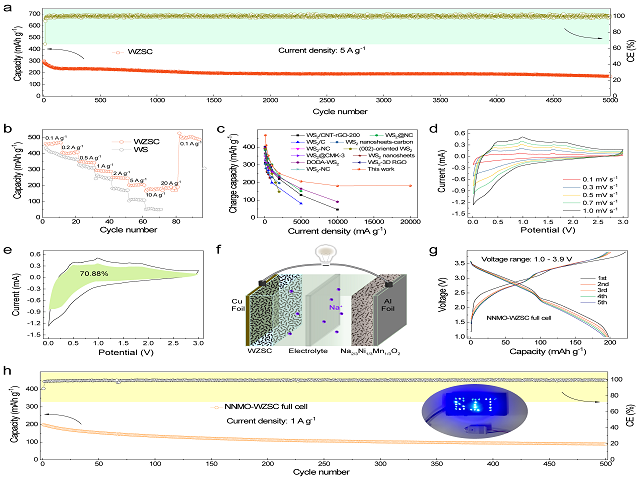 基于上述思想,吳川教授課題組首次報道了一種具有硫空位和異質(zhì)結(jié)構(gòu)的雙金屬硫化物/碳復(fù)合材料,該材料展示出快速的電化學(xué)動力學(xué)特性和出色的可逆容量。該合成手段“一石三鳥”,通過引入金屬有機(jī)框架材料,能夠在WS2納米棒的表面原位生長均勻的ZIF-8層。經(jīng)煅燒處理后,WS2表面上形成了均勻的碳保護(hù)層。此外,由于金屬Zn和W的電負(fù)性差異, Zn與S更易結(jié)合,原位生成WS2/ZnS異質(zhì)結(jié)構(gòu);同時在WS2中形成豐富的硫空位。該復(fù)合材料具備以下優(yōu)點(diǎn):1)均勻的碳包覆層促進(jìn)電子快速遷移并提供良好的電導(dǎo)性,同時抑制循環(huán)過程中材料的體積膨脹,從而保證復(fù)合材料的結(jié)構(gòu)穩(wěn)定性;2)形成的WS2/ZnS異質(zhì)結(jié)構(gòu)能夠產(chǎn)生內(nèi)置電場效應(yīng),促進(jìn)額外的電荷轉(zhuǎn)移,以增強(qiáng)反應(yīng)動力學(xué);3)WS2晶體中產(chǎn)生的硫空位不僅可以提供更多的反應(yīng)活性位點(diǎn),還可以誘導(dǎo)W金屬原子周圍產(chǎn)生過量電子,形成負(fù)電荷中心,加速Na+的快速傳輸。該創(chuàng)新成果突破了二維過渡金屬硫族化合物的鈉離子電池動力學(xué)壁壘,對能源材料的優(yōu)化設(shè)計(jì)以及高比能動力電池的構(gòu)建,提供前瞻性的理論支撐。