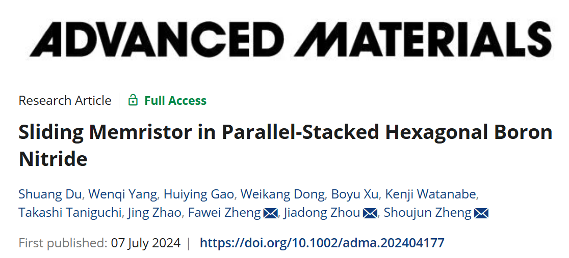 鑒于此,北京理工大學鄭守君副教授、周家東教授、鄭法偉教授共同合作在Advanced Materials在線發表“Sliding memristor in parallel-stacked hexagonal boron nitride”的研究成果(Adv. Mater. , 240417, (2024))。研究者通過利用石墨烯/平行堆疊六方氮化硼(PS-BN)/石墨烯隧穿器件設計了一種滑移憶阻器,它在界面極化的調制下表現出可調的憶阻行為。我們的滑移憶阻器的憶阻行為歸因于帶正電荷的硼離子的層間遷移、聚集和導電絲(CFs)的形成,這也得到了理論計算的支持。我們提出的基于 PS-BN 隧穿器件的滑移憶阻器,可以通過極化和施加電場成功地操縱電阻狀態。滑移憶阻器穩定的記憶窗口和憶阻行為表明,可以通過隧穿電流探索滑移鐵電性,并將其集成到憶阻器中。這一發現不僅為表征滑移鐵電材料提供了一種新方法,還為信息存儲和神經形態計算中的憶阻器應用提供了可能。