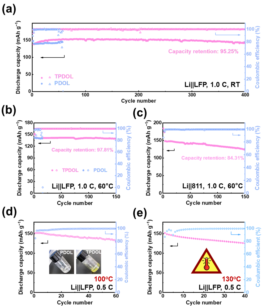 組裝了全電池以進一步驗證TPDOL電解質的應用潛力。由于TPDOL電解質可以構筑更穩定和機械強度更高的富無機SEI層,Li||LFP電池的初始放電容量提高到了148.5 mAh/g,在400次循環后仍保持了95.2%以上的高容量。由于TPDOL電解質具有優異的高熱穩定性和在負極界面可以構筑TGIC衍生的富無機SEI,TPDOL電解質能幫助Li||LFP全電池在60℃時實現高達141.84 mAh/g的初始放電容量,并能夠在200多個循環中穩定地進行充放電,高容量保持率高達97.81%。進一步,Li||LFP電池在100 ℃下能夠實現超過70個循環的穩定循環性能,當工作溫度持續升高到130°C時,Li||LFP電池仍能穩定循環超過40個循環(圖4)。