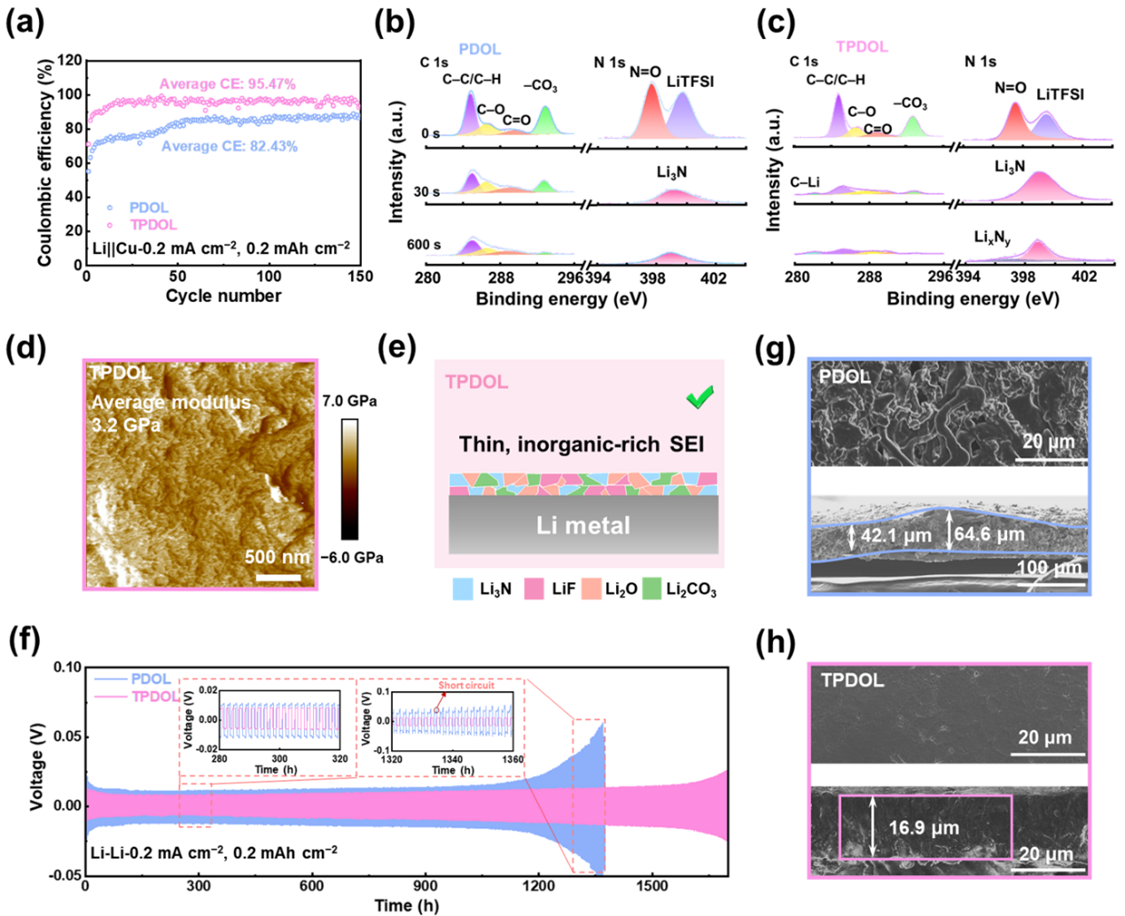 此外,在Li||Cu半電池中,TPDOL電解質可以幫助電池循環150次,并保持95.47%的高平均庫侖效率。X射線光電子能譜測試顯示,TPDOL電解質中金屬鋰負極的SEI厚度較薄,且形成了富無機的SEI。原子力顯微鏡(AFM)顯示,TGIC衍生SEI的楊氏模平均為3.2 GPa,是PDOL衍生SEI的1.8倍(平均為1.8 GPa)。并且采用TPDOL電解質的Li||Li對稱電池穩定循環超過1700小時,沉積的金屬鋰形貌較為平坦,沉積鋰更薄結構更致密(圖3)。