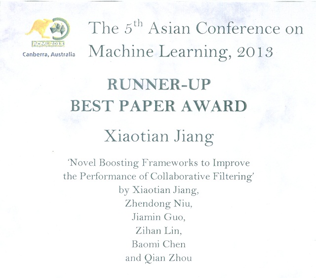 日前,我校計算機學院碩士研究生江小天等人(指導教師:牛振東)的論文"Novel Boosting Frameworks to Improve the Performance of Collaborative Filtering"被國際會議ACML2013錄用為長文,并獲得此次會議的“Runner-Up Best Paper”獎。