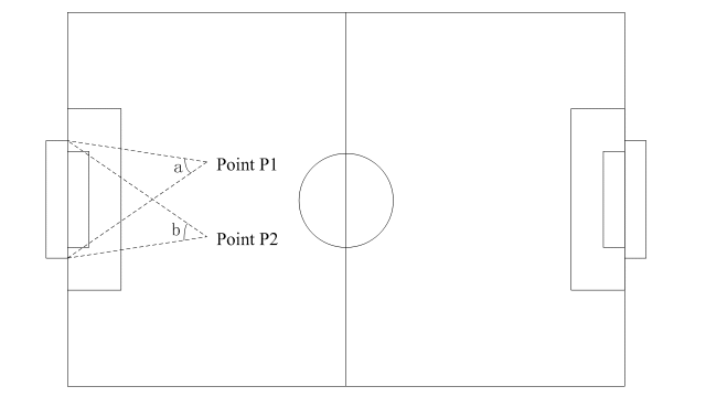 根據對球門威脅的不同,和足球比賽的規則,可以將球場劃分多個區域。場地劃分主要是根據球所在的位置進行的。而場地的分塊線,主要是根據球的射門角作為主要依據的。如圖1所示,假設P點和p1點為門前任意一點。當a=b時,P點和P1對門的威脅程度相同。