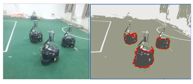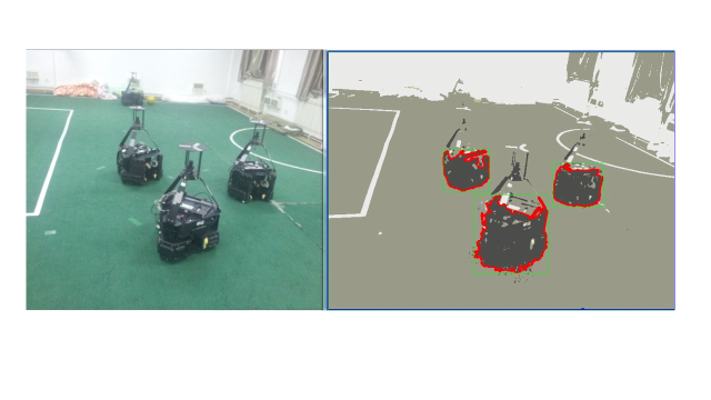 中型組機器人足球比賽的對抗性極強,機器的移動速度極快,因此對機器人的反應能力有很大的要求。對守門員來說,其應對的是對方的高速射門,所以球定位的速度及準確度要求尤為嚴格。但是限于機器搭載的計算機的處理能力,難以達到這樣實時處理圖像的要求。為解決此問題我們提出了視覺自適應系統的解決方案。該系統以人為事先預定的知識為依據,然后由機器對環境逐步自學習、自適應,表現為越來越準確的識別效果。同時為了降低所需要處理數據的空間復雜度,視覺系統將原有的全局搜索變為局部跟蹤,使用粒子濾波算法,建立物體特征的離散模型,并增加中值濾波來對所記錄的物體特征進行更新以達到對物體的特征跟蹤和學習的同步。同時處理的數據也由原本的圖像矩陣,減少為100到200的特征點的權值和坐標分布。最后再輔助以霍夫變換等圖像處理方法,實現對球、障礙物、場線的快速識別,使機器可以實時掌握賽場信息。該系統識別效果如圖4所示。