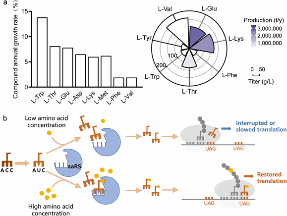 氨酰化是一種兩步多底物反應,其速率不僅取決于兩種主要底物tRNA和氨基酸的濃度,還取決于它們各自與氨酰化合酶(aaRS)的親和力。抑制這些因素中的任何一個都會破壞氨酰化過程,而促進其他因素應該可以補償這種負面影響。基于這一原理,可以根據目標氨基酸,使用與aaRS或aaRS-aa親和力降低的tRNA,篩選目標氨基酸的高產菌株。其中,改造tRNA的反密碼子是一種通用且簡便的降低其與aaRS親和力的方法。而在所有64個密碼子中,琥珀密碼子UAG通常不編碼氨基酸,將tRNA的反密碼子更改為UAG互補三聯體(CUA)提供了一種通用的解決方案,既可以降低tRNA與同源aaRS的親和力,又可以防止干擾其他氨基酸的正常翻譯。