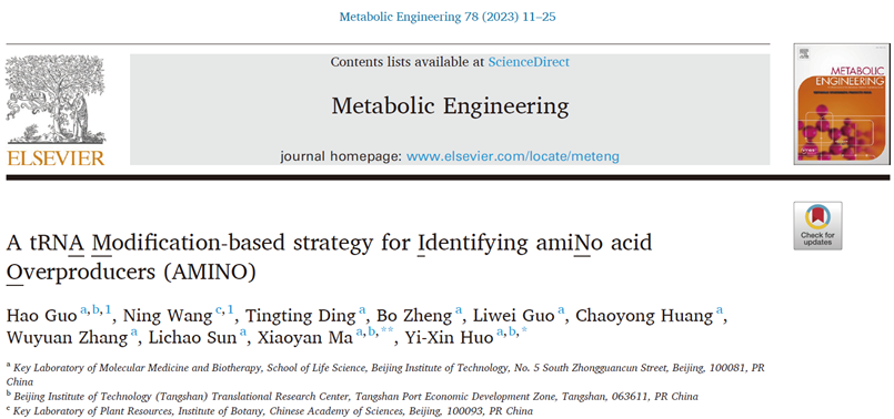 編輯:肖雯 審核:周連景 閱讀次數:近日,北京理工大學霍毅欣教授團隊在氨基酸高產菌株的篩選策略方面取得重要進展。相關成果以“A tRNA Modification-based strategy for Identifying amiNo acid Overproducers (AMINO)”為題,在頂級期刊《Metabolic Engineering》(影響因子:8.829)上發表(doi.org/10.1016/j.ymben.2023.04.012)。該工作以北京理工大學為第一通訊單位,霍毅欣教授和馬曉焉特別副研究員為共同通訊作者,已出站博士后郭昊及王寧博士為共同第一作者。