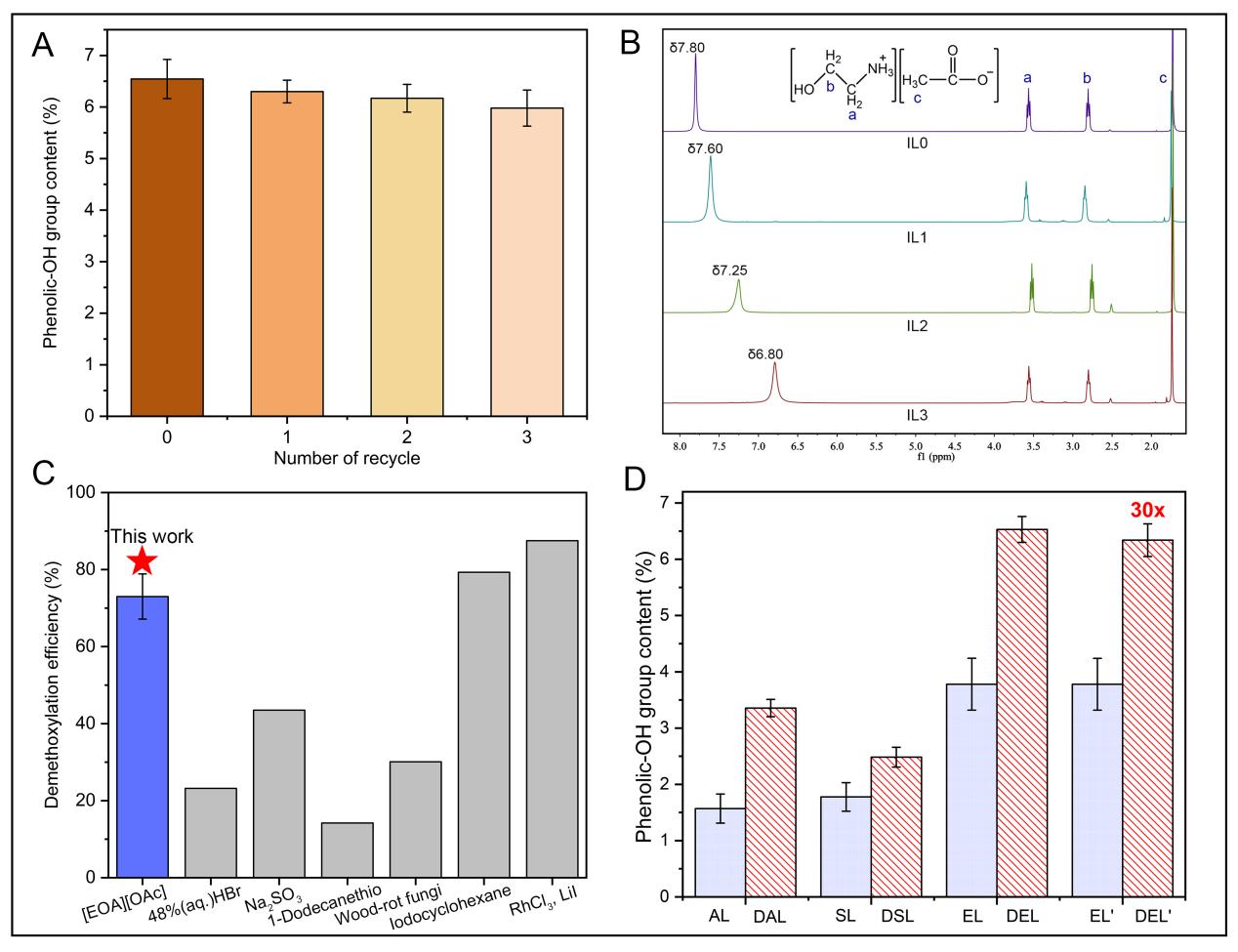 圖3. A) 循環產物中的酚羥基含量;B) 回收PIL的結構穩定性;C) 不同方法的木質素脫甲基化效率對比;D) 不同類型的木質素脫甲基化效果。