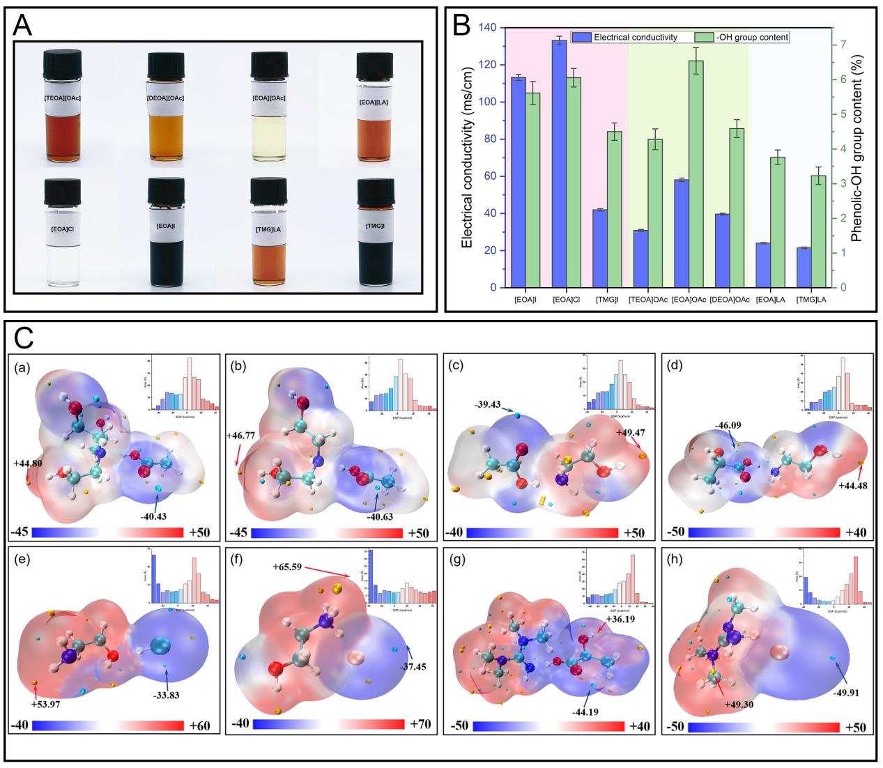 圖2. A) 選用的8種PILs;B) PILs的電導率及脫甲基化產物的酚羥基含量;C) 8種PILs的表面靜電勢分析。