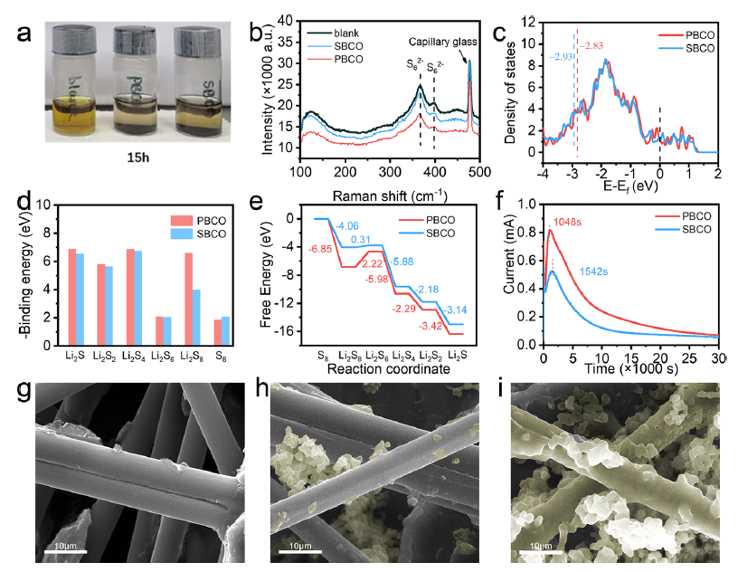 圖4. PBCO與SBCO在多硫化物吸附和氧化還原轉(zhuǎn)化理論計(jì)算和實(shí)驗(yàn)中的比較