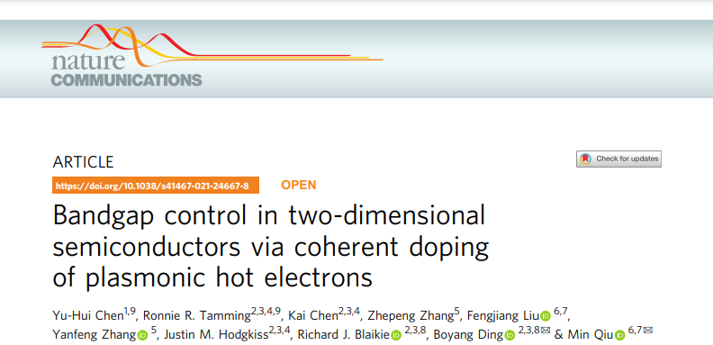 編輯:王莉蓉 審核:姜艷 閱讀次數:日前,北京理工大學物理學院張向東教授課題組青年教師陳宇輝研究員與新西蘭維多利亞惠靈頓大學、奧塔哥大學,以及北京大學和西湖大學的研究者開展合作,在表面等離子體光學腔和二維半導體二硫化鎢的復合體系上,通過利用光和物質強耦合效應,在實驗上實現了對二硫化鎢的高效熱電子摻雜,大幅改變了二硫化鎢原有的帶隙,相關研究成果發表在國際頂級期刊《自然·通訊》上。