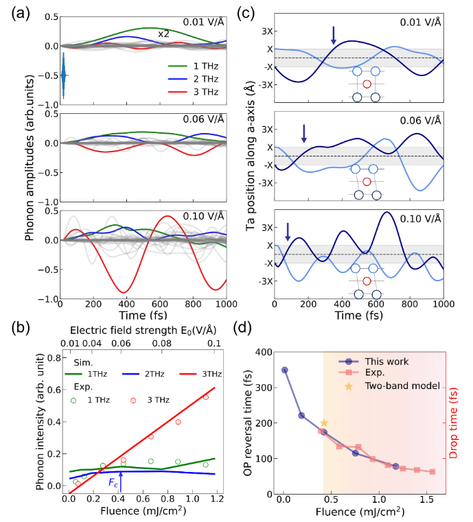 圖2. 聲子激發(fā)及誘導(dǎo)的晶格序參量反轉(zhuǎn),并與實(shí)驗(yàn)結(jié)果進(jìn)行對(duì)比。