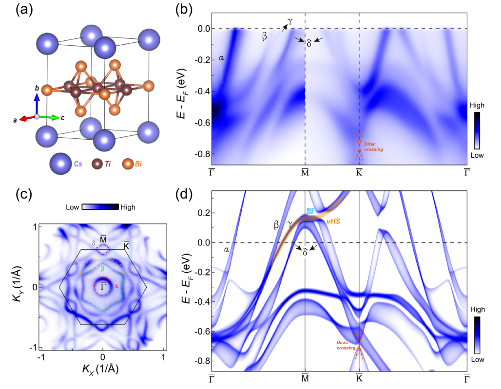 圖1. CsTi3Bi5的晶體結構和電子能帶結構